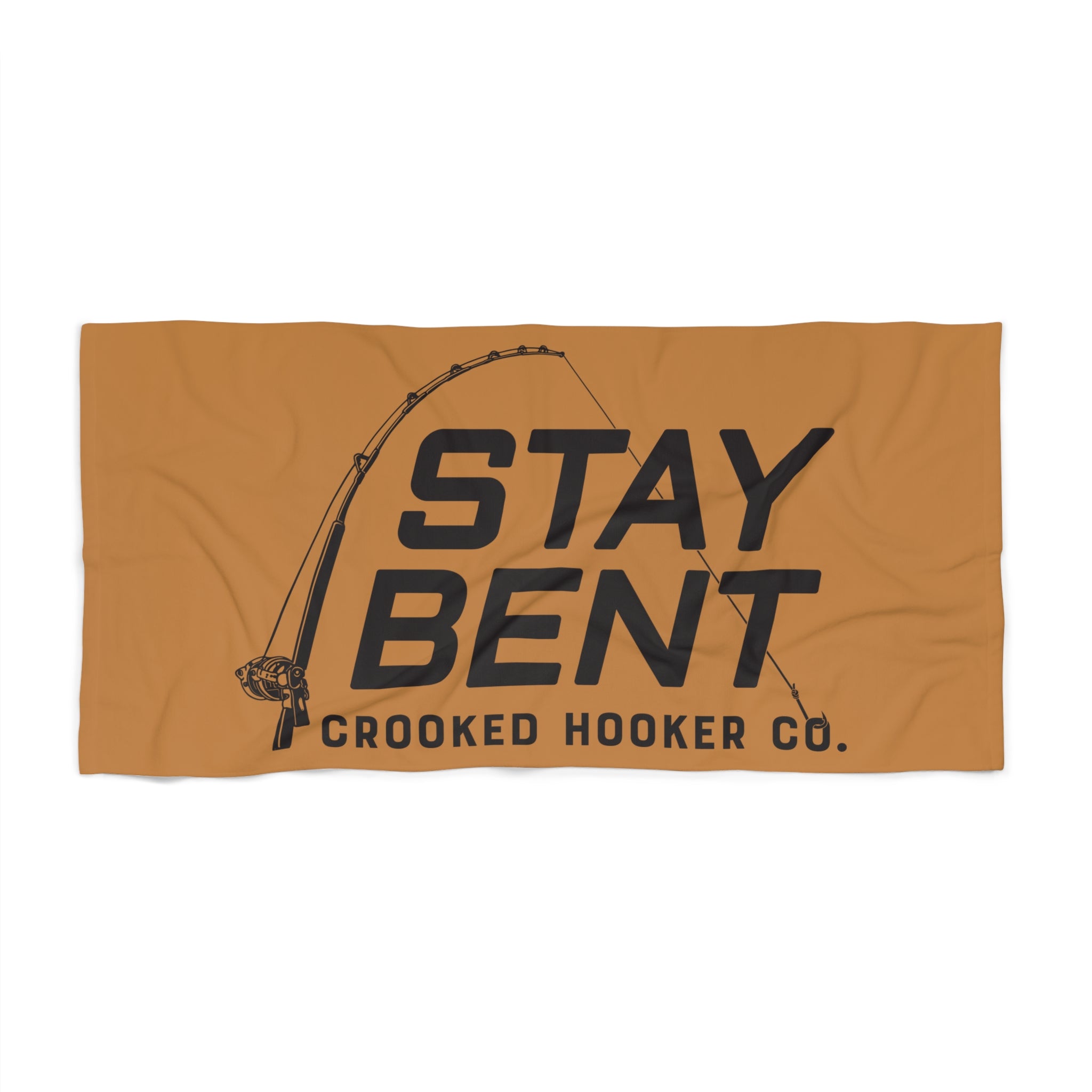 A warm, sand-colored beach towel stamped with bold, outdoorsy lettering and a curving fishing rod graphic. The design reads “STAY BENT” with a subtle Crooked Hooker Co. tag beneath — a quiet nod to hard days on the water and the small victories that come with hauling in a good one. The towel’s printed face holds crisp color and strong lines, while the plush cotton loop backing feels soft against sun-warmed skin. Lightweight and quick-drying, it folds easily into a boat bag or cooler and lays flat for a post-fish nap or a sunny afternoon on the shore. It carries the mood of slow mornings, salty air, and the friendly grit of anglers who spend more time chasing bites than scrolling feeds.
